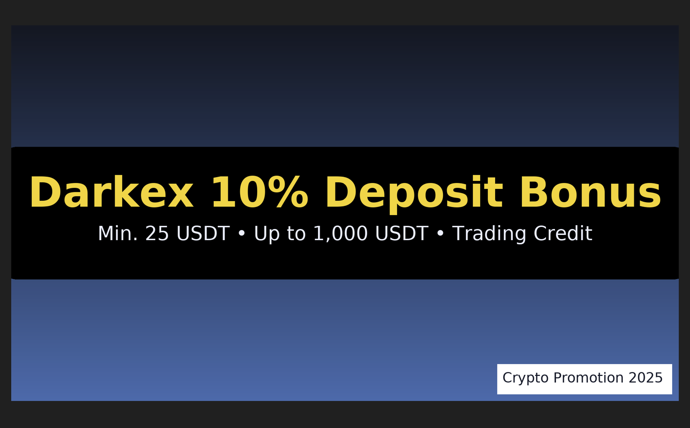 Darkex is running a campaign that credits a 10% Trading Bonus on your net deposit (deposits minus withdrawals), starting from 25 USDT minimum. The bonus is credited instantly after you submit the request via the official form or live support. Campaign start: September 1, 2025 (UTC+2); end: TBA.