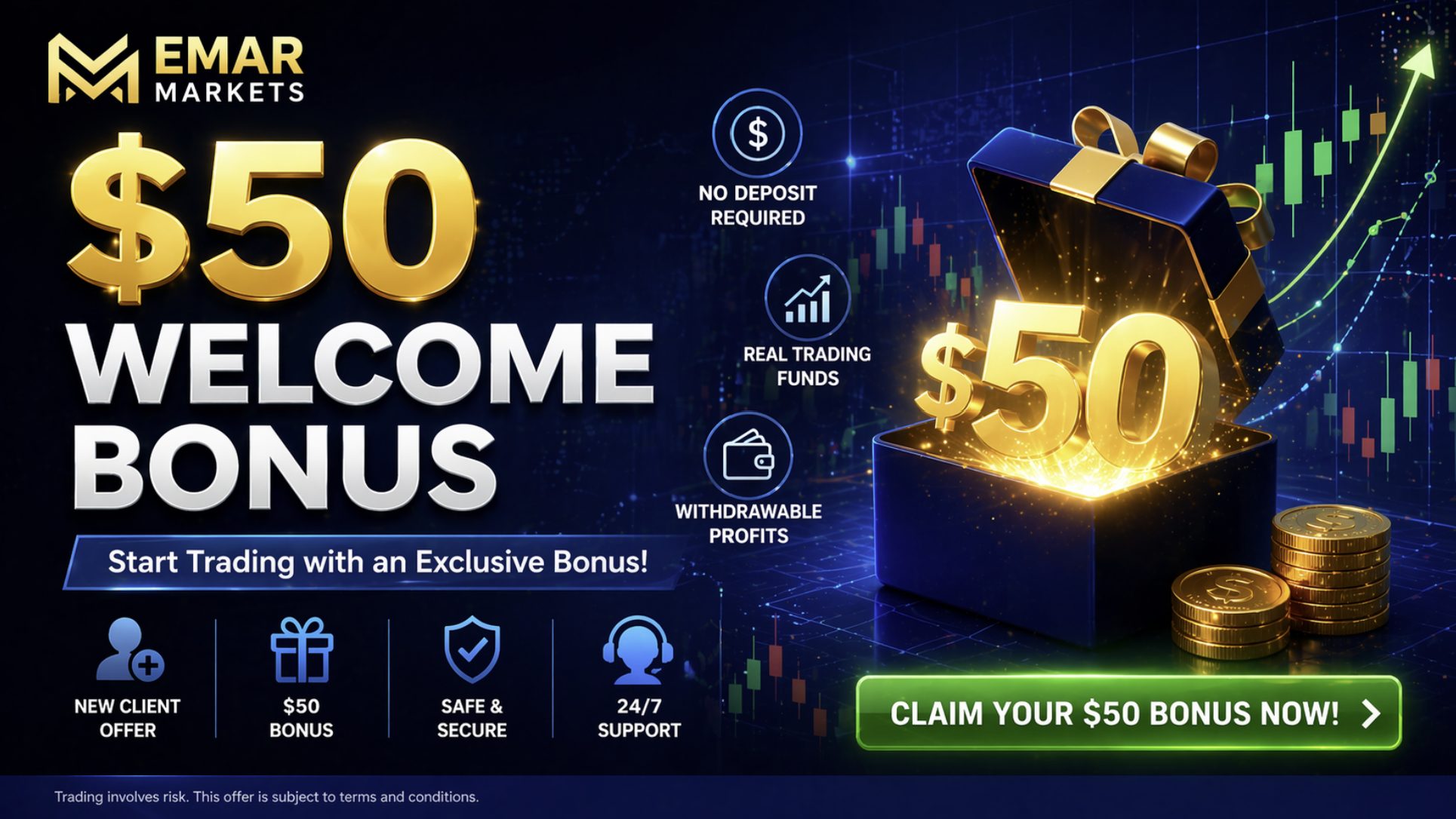 The EmarMarkets $50 Welcome Bonus is a limited-time promotion designed for new traders who want to start with an extra boost. According to the official page, eligible users can activate a $50 welcome bonus after completing the account setup process and making a qualifying deposit. The promotion is presented as a way to kickstart a trading journey with extra capital and access to the broker’s trading environment.