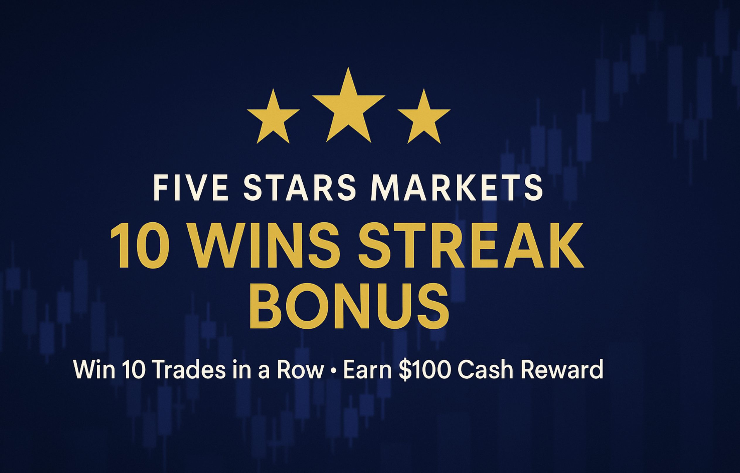The 10 Wins Streak Bonus is a performance-based trading campaign by Five Stars Markets that rewards traders who achieve 10 consecutive winning trades. Once you hit the streak, you can receive a **bonus reward up to $100**.