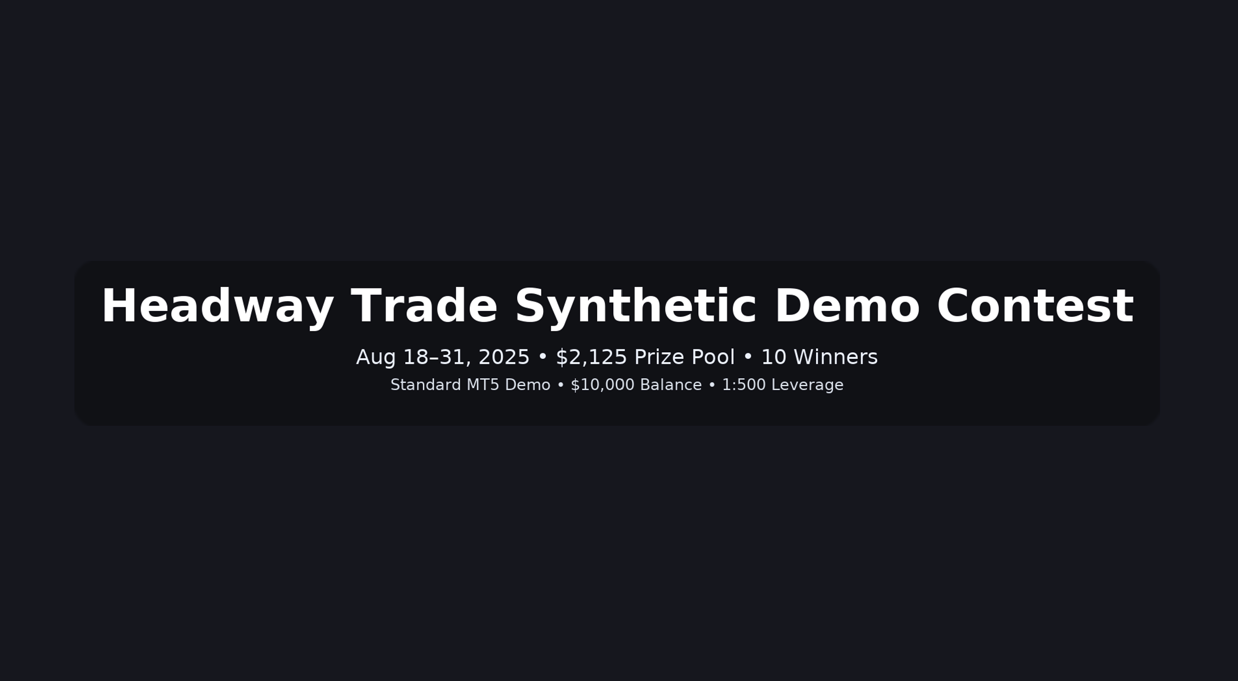Headway’s Trade Synthetic Demo Contest is a limited-time, risk-free competition where traders use a special demo account to trade synthetic pairs and compete for a $2,125 prize pool. Registration opens in August and the trading phase runs for two weeks, with 10 winners and fully withdrawable cash prizes.